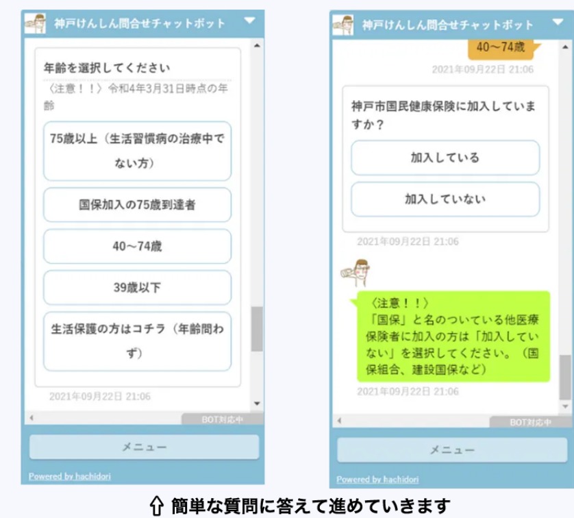 チャットボットの運用では、担当者に代わって「年齢」「健診内容」「受診券の有無」などの簡単な質問を行い、該当する健診に関する手続きやご案内を回答しています。