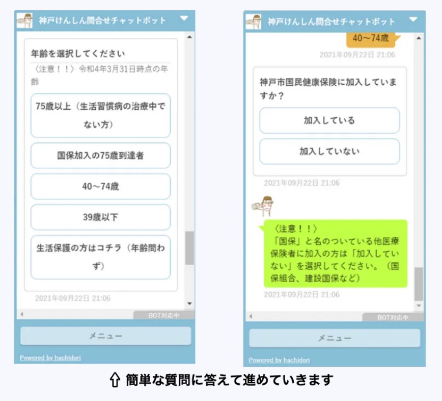 チャットボットを導入して、電話での担当者に代わって「年齢」「健診内容」「受診券の有無」など簡単な質問を行い、当該する健診に関する手続きの案内や回答を行っています。