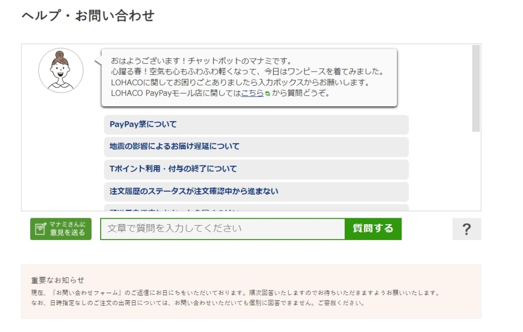 アスクル株式会社がヤフー株式会社の協力により運用している通販サイトである「LOHACO」も2014年に「マナミさん」というチャットボットを導入しています。
