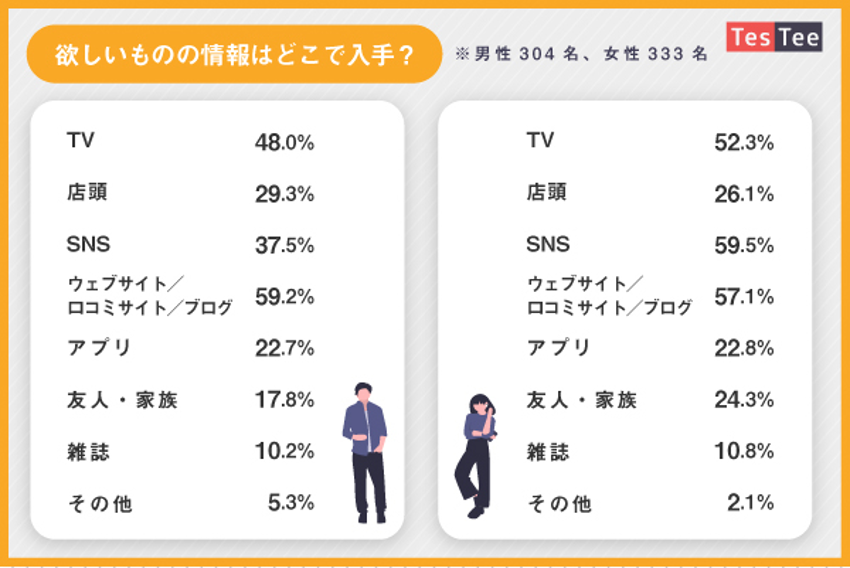 株式会社テスティーによる調査によると、20代~30代の男女637名を対象に調査を行ったところ、男性はおよそ4割、女性はおよそ6割が欲しいものに関する情報収集を行っていることが明らかになりました。このことから、SNSLINE公式アカウントにおける宣伝効果の大きさがうかがえます。