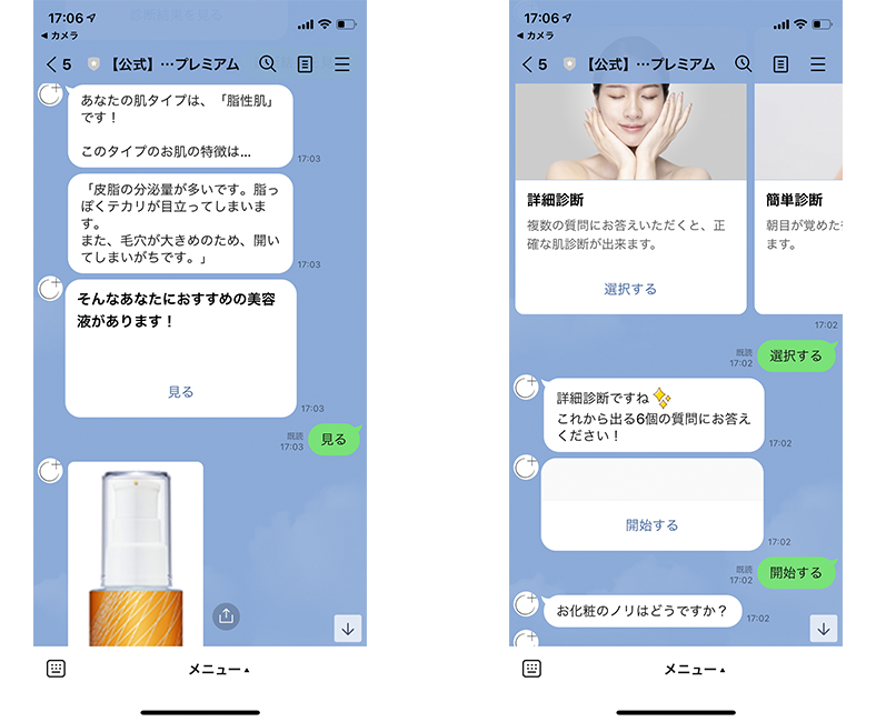 LINEの友だち登録を行うと「肌診断」コンテンツを楽しむことができるだけでなく、いくつかの質問に答えるとユーザーの肌を診断して「ユーザーに合った商品の提案」を行うことができます。