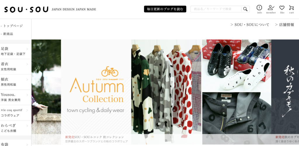 sousouは実店舗をもつアパレルのネットショップです。実店舗の誘導もわかりやすく地図情報も掲載されています。多言語化、海外発送にも対応しています。ブログの更新を毎日行っておりネットショップと実店舗を組み合わせた事例として参考になります。