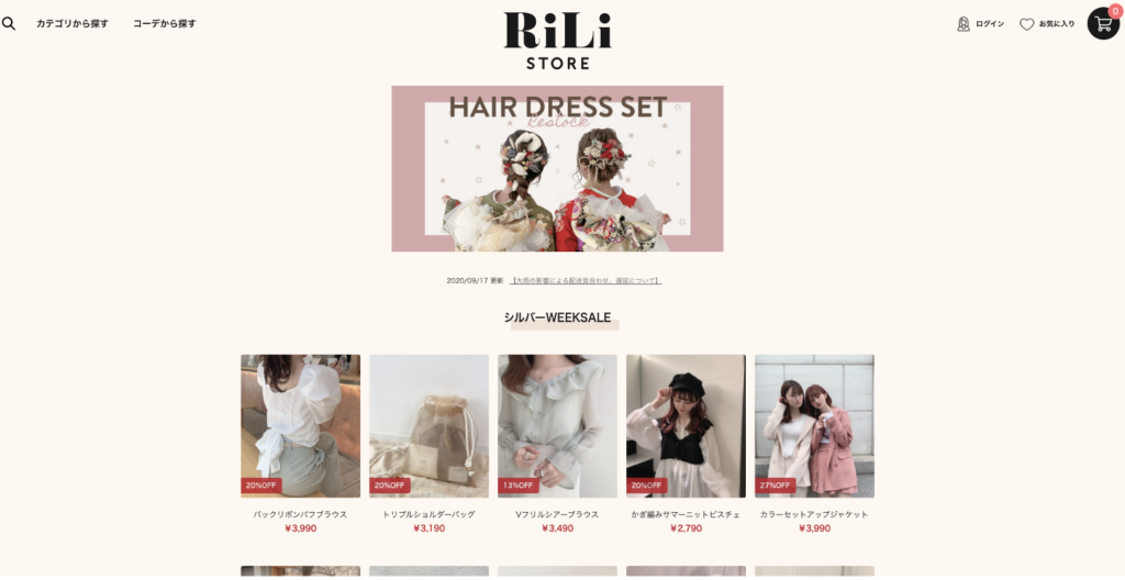 女性向けファッションメディアRiLi(リリ)が運営している「RiLi STORE(リリストア)」。韓国ファッションを中心に取り扱っており、10代~20代の女性に大人気のセレクトショップです。可愛らしい雰囲気のサイトデザインが、ブランドにとてもマッチしています。また、「予約」や「◯%OFF」などのバッジをつけており、お客さんに分かりやすいサイトデザインが印象的です。さらに、在庫切れの商品が再入荷時にアラート(EメールまたはSMSテキストメッセージ)がなる機能も追加しており、お客さんのエンゲージメントとコンバージョンを高める設計になっています。