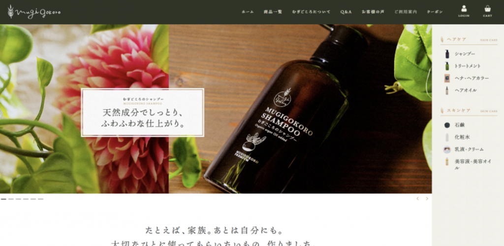 「無添加」を売りにしたオーガニックコスメが主力商品となりますので、イメージに合うようアースカラーの配色を採用し、文字フォントは柔らかく、さらに商品写真にも高級感が感じられるよう、花々などの小物を使用して、商品撮影を行っています。