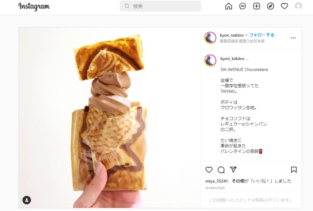 そんなきょん。さんは阪急梅田本店で開催された(2018年2月14日)バレンタインチョコレート博覧会で販売されていた「たい焼きソフト」をシンプルな構成で撮影し、写真をInstagramに投稿して話題を集めていました。