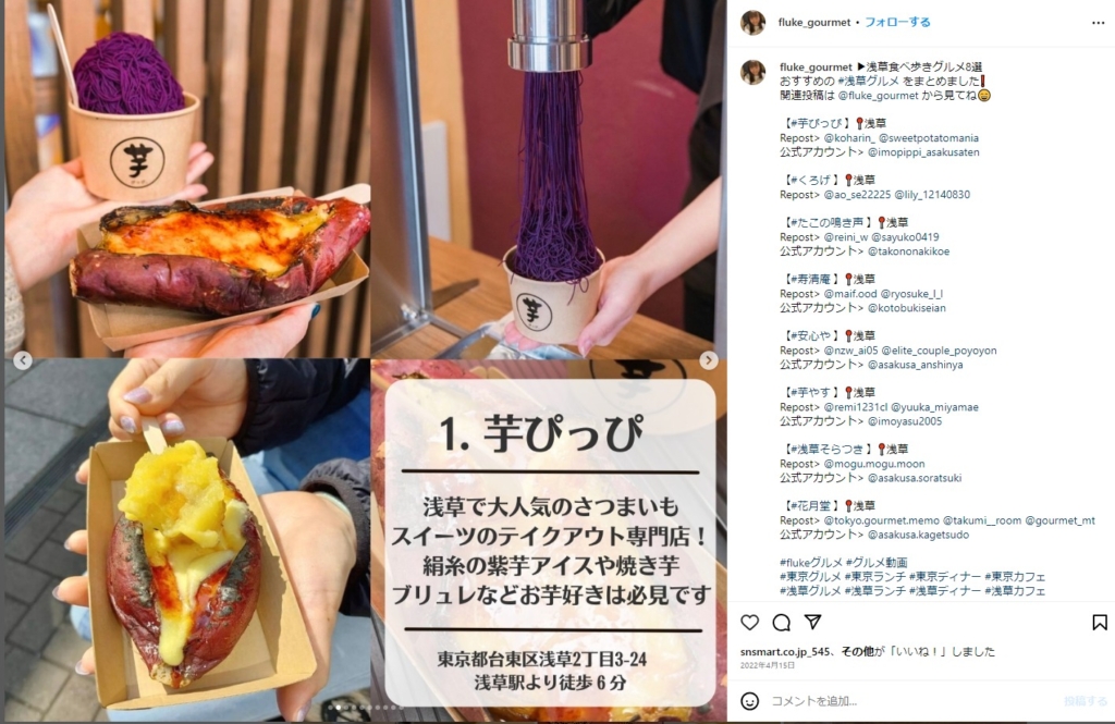 上記の画像は、グルメ関係の投稿をInstagramを活用して発信を行っている事例です。