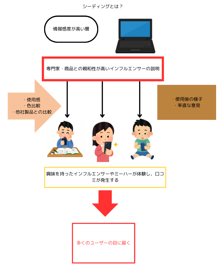 そのため、インフルエンサーマーケテイングを含むシーディングマーケテイングが重要となります。