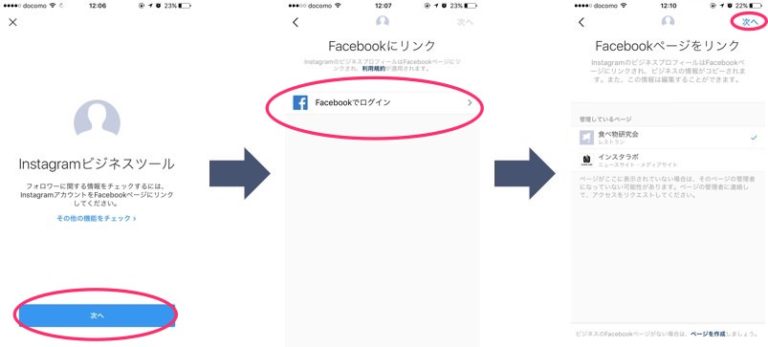「Instagramビジネスツール」の画面が表示されたら下部の「次へ」を選択し、次の画面で「Facebookアカウントでログイン」を選択します。