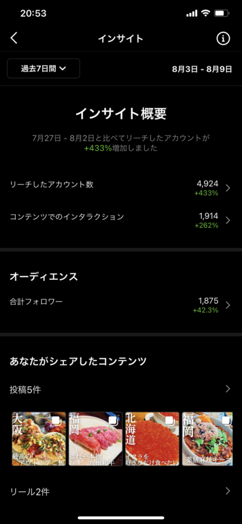 上記の情報を元に、どのような投稿が人気になるのか、その投稿のどの箇所を改善すれば良いかなど、分析をした上で改善をしながらアカウントの運用をしていきましょう。