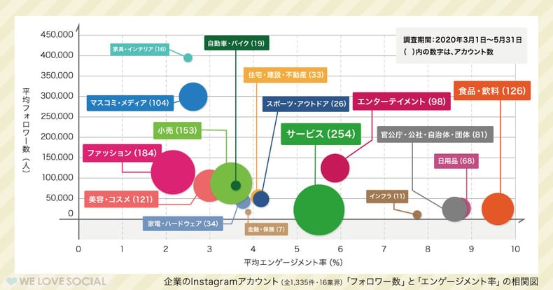 参考、画像引用 Instagramの企業アカウント16業界1,335件を分析!フォロワー数の多い業界・エンゲージメントの高い業界は? We Love Social