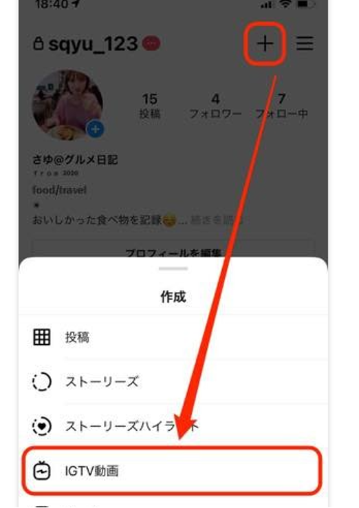 虫眼鏡の検索画面から『IGTV』を選び、動画がランダムに表示されるページの右上に『+』のボタンがあるので、タップします。