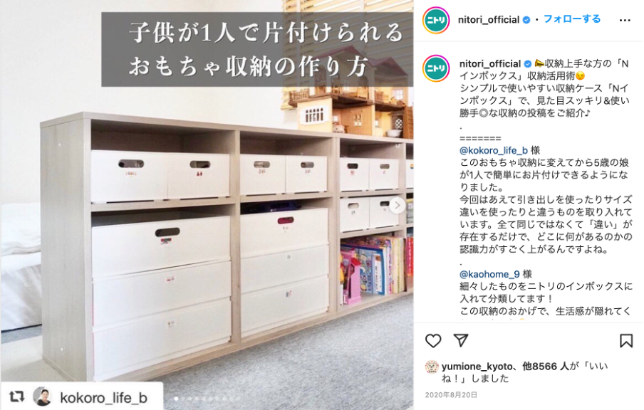 たとえばユーザーが商品やサービスを利用した感想をInstagramにて投稿した際、リポストすることによって自分のアカウントで引用し再投稿するといった使い方になります。