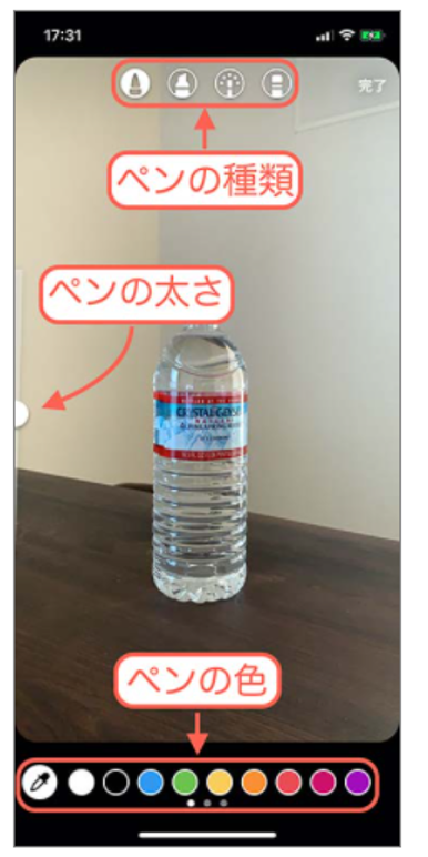 ペン編集では、画面の上にある4種類のペンを使って写真を加工することができます。