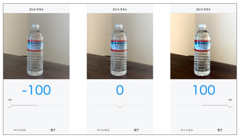「コントラスト」では、写真の明るい部分と暗い部分の差を調整することができます。