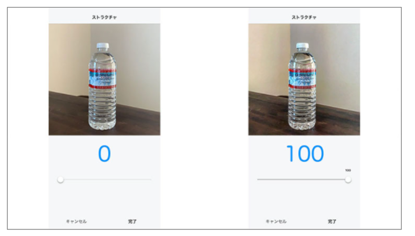 「0」〜「100」の間で調整でき、数字が大きくなるにつれて写真の輪郭が強調されていきます。