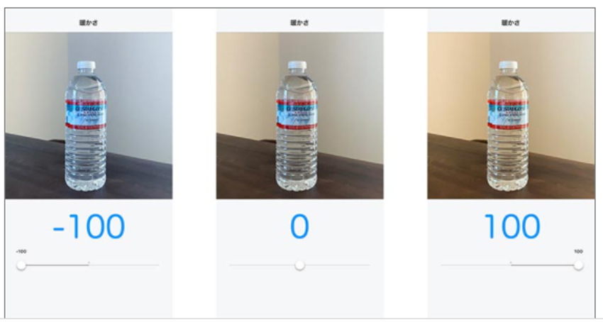 「-100」〜「100」の間で調整でき、数字が大きくなるにつれて寒色(ブルー系)から暖色(オレンジ系)に変化していきます。
