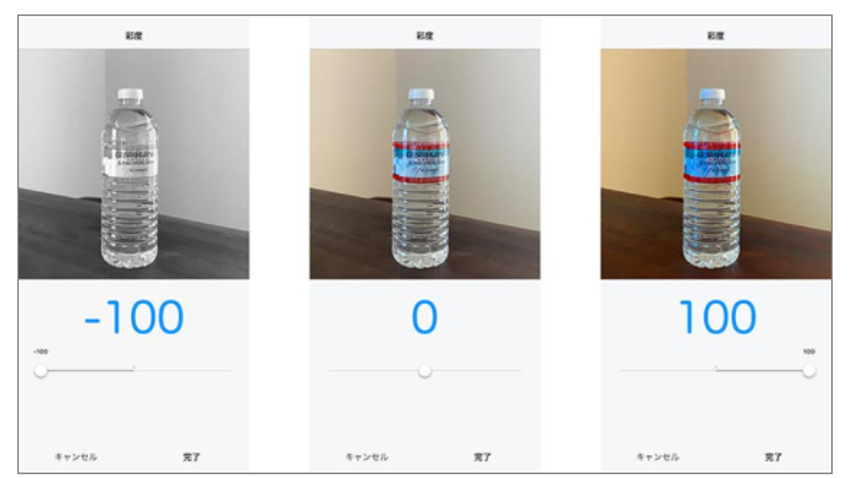 「-100」のときは、色味がなくなりモノクロになり、「100」のときは、色味が強く鮮やかな仕上がりになります。