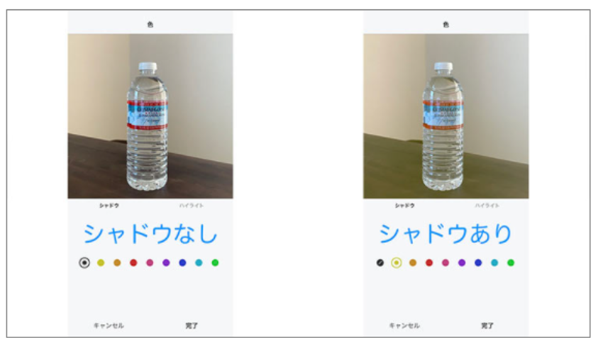 「色」では、写真の暗い部分(シャドウ)と明るい部分(ハイライト)にそれぞれ色をつけることができます。
