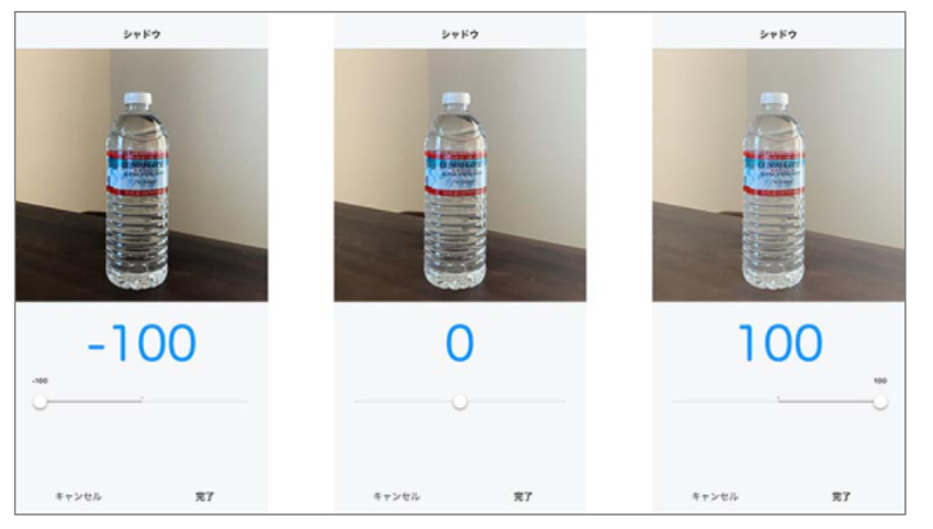 「-100」〜「100」の間で調整でき、数字が大きくなるにつれて写真の陰影がはっきりとしていきます。