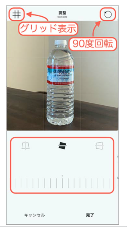 「調整」では、写真の回転や、写真を縦や横の傾きを調整することができます。