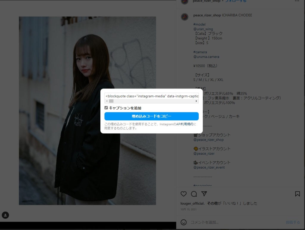 埋め込まれたInstagramの投稿写真をクリックしますと、Instagramへと遷移します。