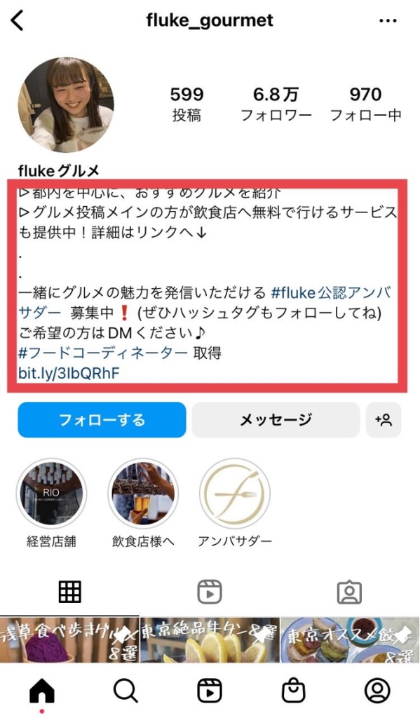 キャプションにユーザーが検索しそうな単語を使うことで、検索結果に表示されやすくなります。ただし、プロフィールと同様に丈長にならないように注意しましょう。検索結果に表示されにくくなります。