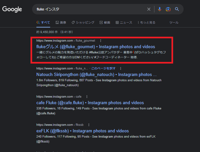 Instagramで検索を行なうと、キーワードがプロフィールに含まれている場合も検索結果に表示されます。