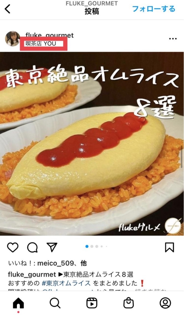 投稿をする際に、ジオタグ(上画像赤四角内、位置情報を示すタグ)を付けるのもポイントです。