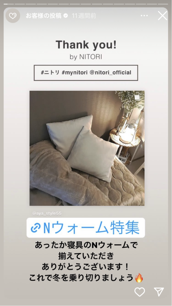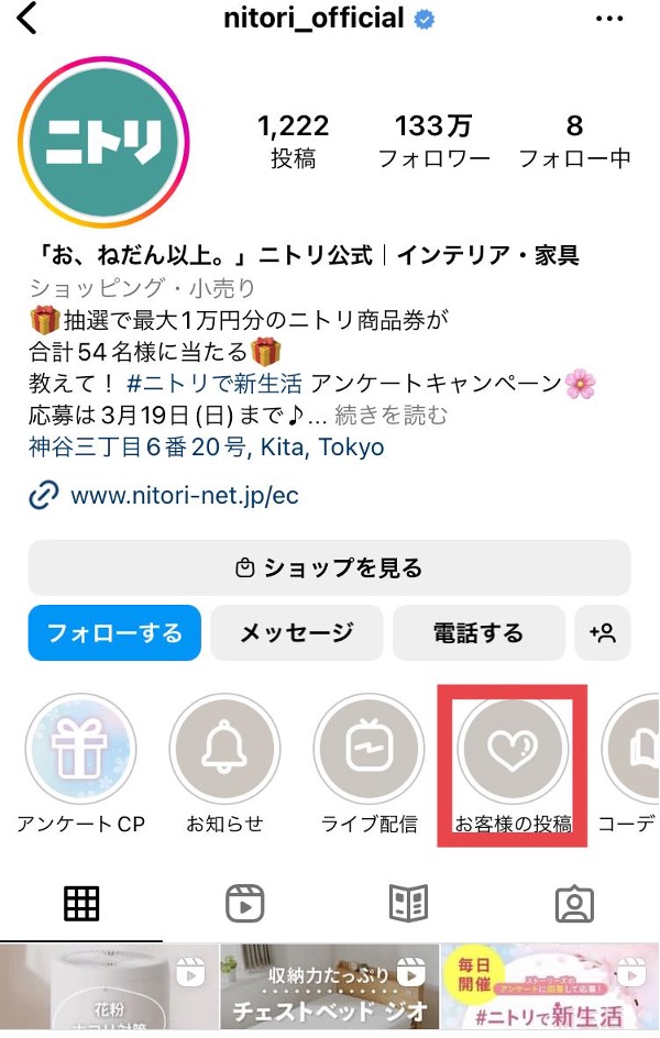 インテリアを中心とした多様な商品を販売している「ニトリ」のアカウントでは、上画像のようにお客様の投稿をハイライト機能で紹介しています。