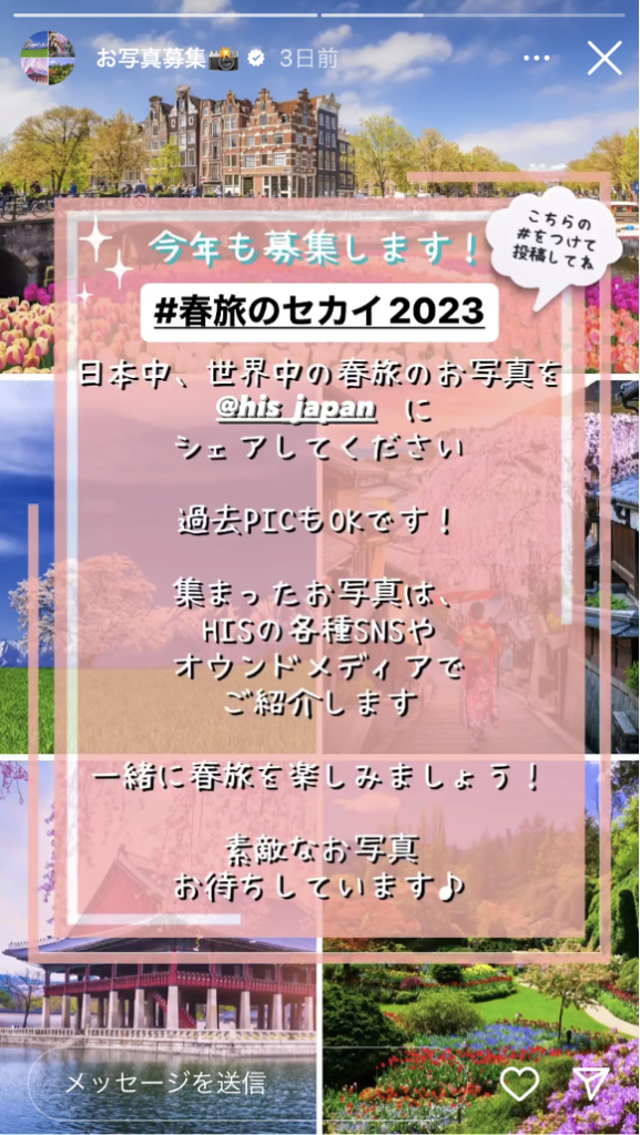 大手旅行代理店のH.I.Sは季節や年度に応じたハッシュタグを作成して、テーマに沿った写真の投稿を促すことで、UGCを増やしています。