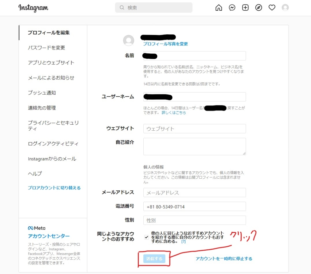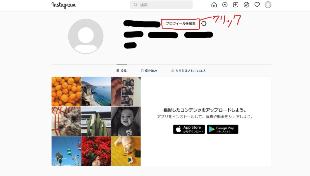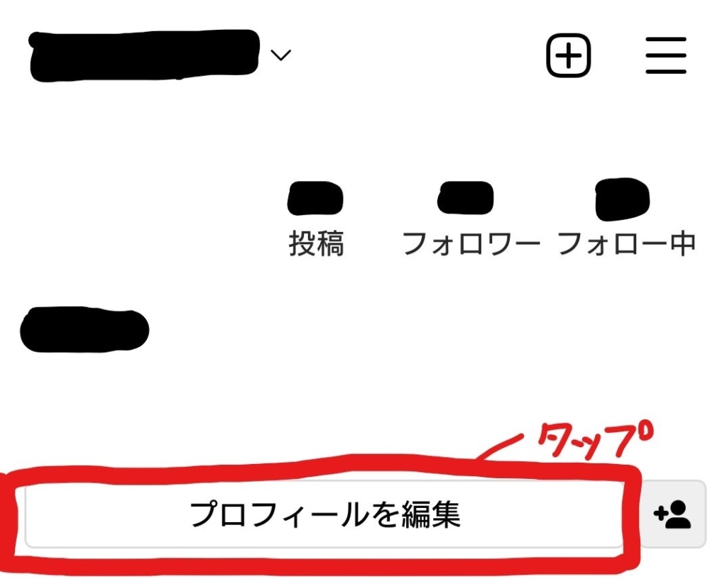 Instagram上の自分のプロフィール画面に移行し、「プロフィールを編集」を選択します。
