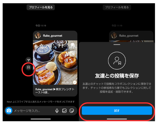 ②DMで友達にシェアした投稿をコラボコレクションに保存