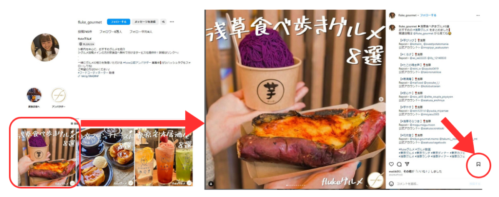 ①保存したいフィード投稿を探して、「保存」アイコンを選択