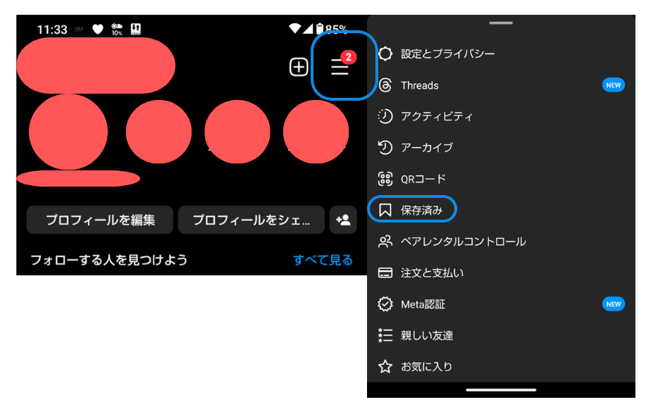 ①プロフィールタブ右上にある「三本線」メニューを選択