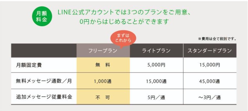 料金について、アカウント開設時は無料の「フリープラン」となっています。有料プランには「ライトプラン」「スタンダードプラン」があり、月ごとの無料メッセージ通数と追加メッセージの従量料金に違いがあります。