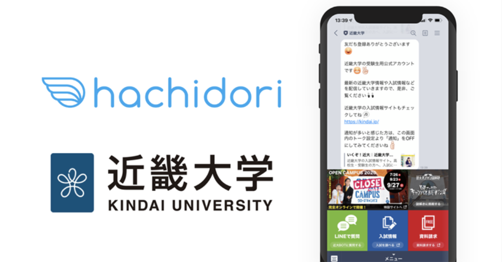 NoCodeチャットボットツール「hachidori」が、近畿大学が運営するLINE公式アカウント「近畿大学」に採用され、実際に24時間365日チャットボットで質問対応を行っており、特にオンラインでのオープンキャンパス実施日には1日で約700名の受験生が利用しました。