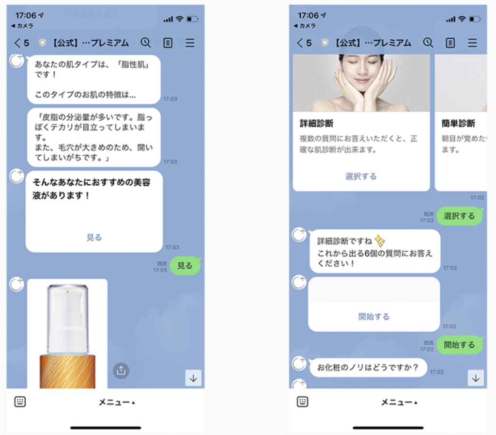 LINEにて肌の悩みや改善方法をメッセージするとその悩みにあったページの紹介をしてくれます。チャットボットを導入することによりCVRの向上を達成しました。