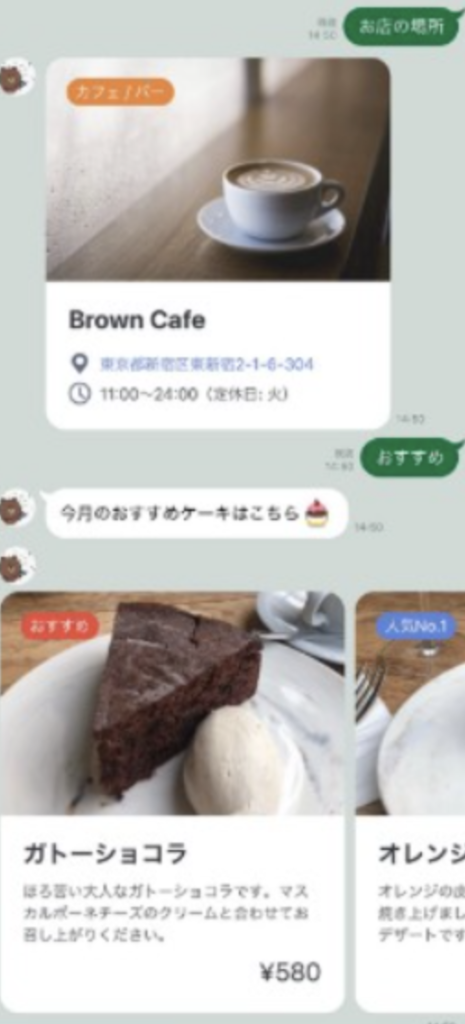 また、リッチメニューを選択するとボットが自動でメッセージを送信し、案内してくれます。