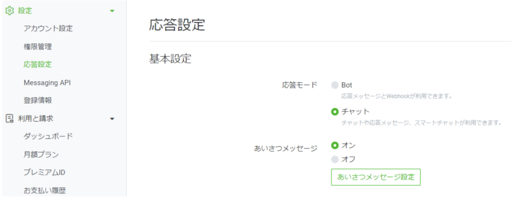 LINE公式アカウントでは、応答メッセージを使う場合は、チャットを同時に使用することができません。