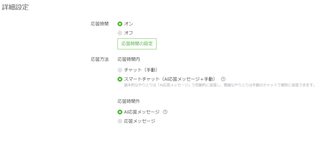 右上にある「設定」から応答設定をクリック。「応答設定」から「詳細設定」の「応答方法」を「スマートチャット」にします。