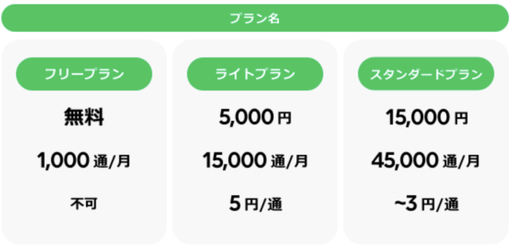 「フリープラン」であれば無料で利用できますが、メッセージ通数が1,001通を超えると有料の「ライトプラン」になります。