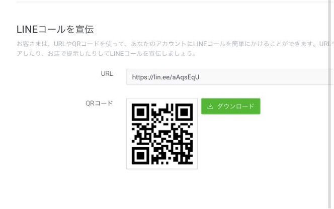 また、以下の画像のようにLINEコールの宣伝用URLの取得やQRコードのダウンロードも可能です。