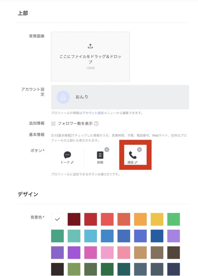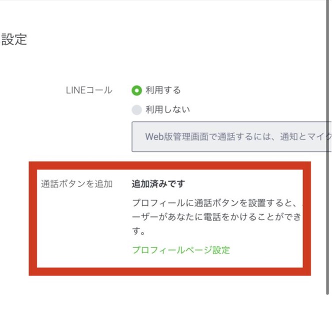 1.設定画面のLINEコールの下の箇所に、「通話ボタンを追加」をクリックします。