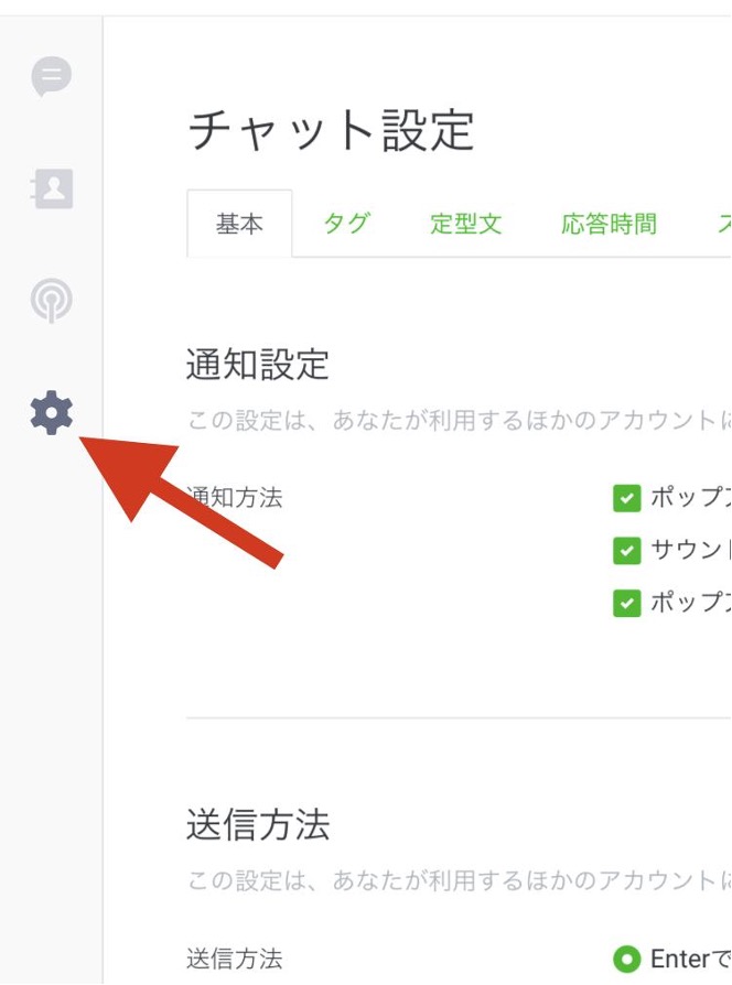 2.上の方のメニューから「チャット」をクリックし、右に表示される「歯車マーク」をクリックして下さい。