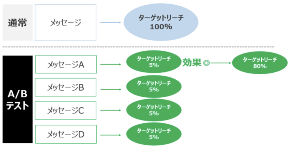 ABテストメッセージは複数のメッセージを作成して、特定割合のユーザーに配信し効果の比較ができます。