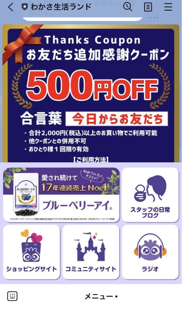 わかさ生活さんのリッチメニューはブルーベリーアイのキャラクターを活かし、分かりやすいデザインで作成されています。