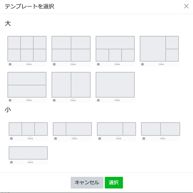まず最初に、リッチメニューのテンプレートを以下の6種類の中から一つ選択します。