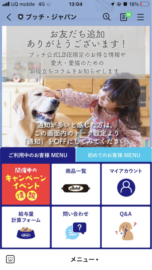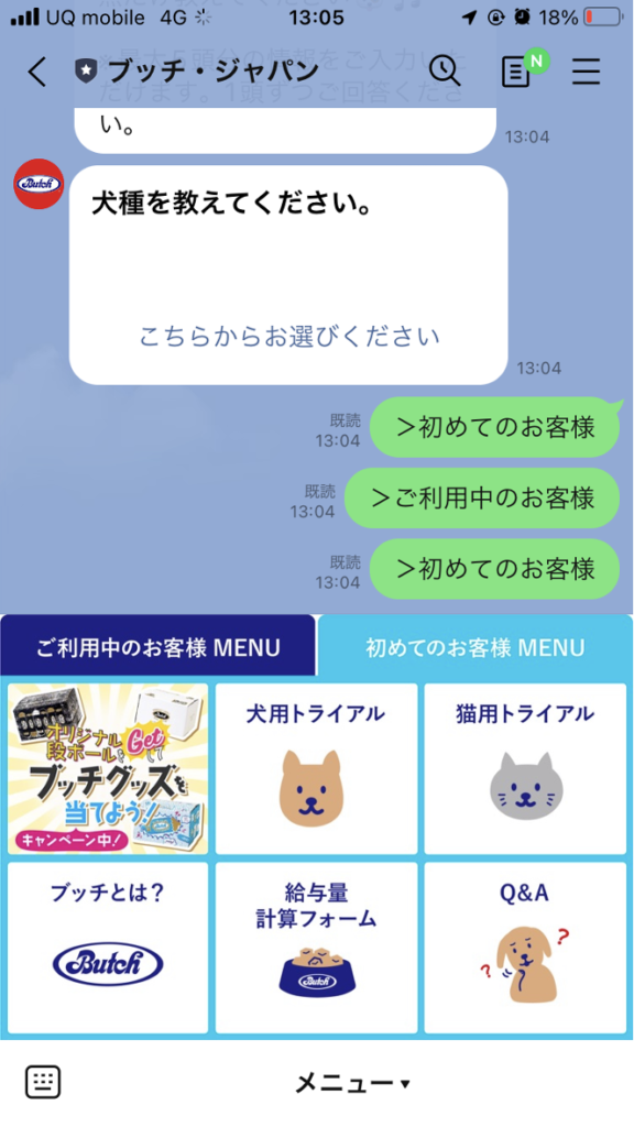 また、ブッチ・ジャパンのLINE公式アカウントのリッチメニューは利用者の方と、初めての方向けに2つのメニューが用意されています。