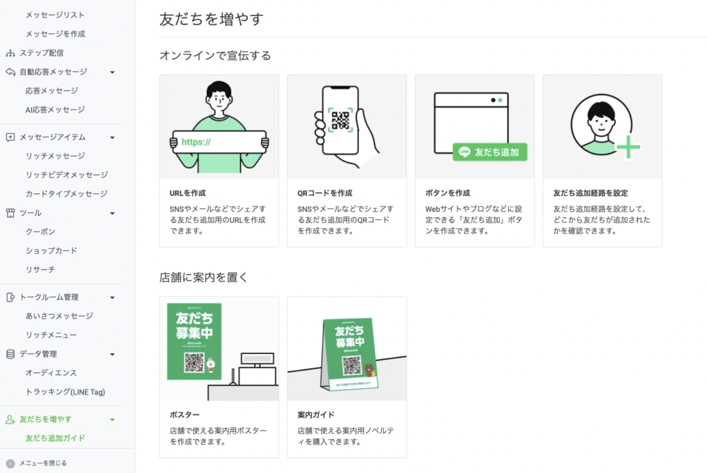 LINE公式アカウントの管理画面の左下に表示されている「友だち追加ガイド」を選択します。