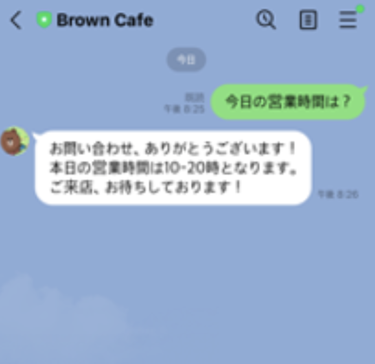 たとえば、下記の画像では「営業時間」というキーワードをあらかじめ設定していたことで、ユーザーから送られてきたメッセージに自動で返信しています。